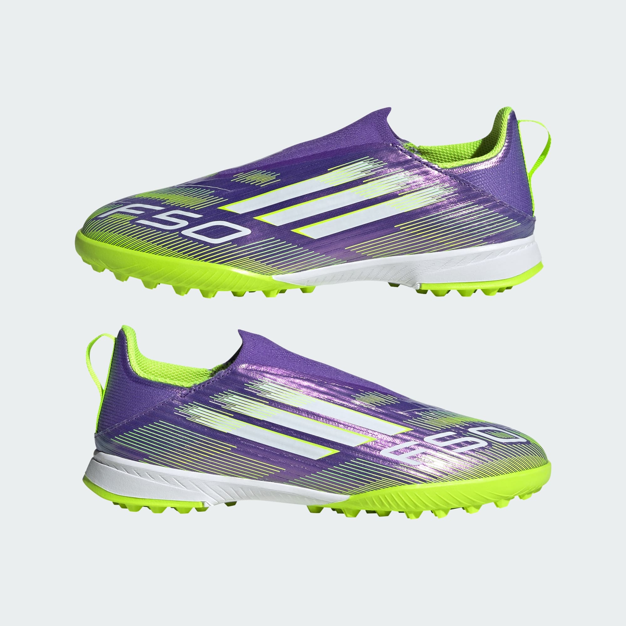 Encuentra tu rapidez para expresarte de verdad en la cancha. Siente la adrenalina con los chimpunes adidas F50, para la velocidad. Destacando por su llamativo estampado Sprintgrid, el exterior Fiberskin de estos chimpunes de fútbol League para niños emplea un cuello adaptable sin cordones para una sujeción sólida y un golpeo limpio. La suela de caucho con toperoles ofrece velocidad sobre pasto sintético.