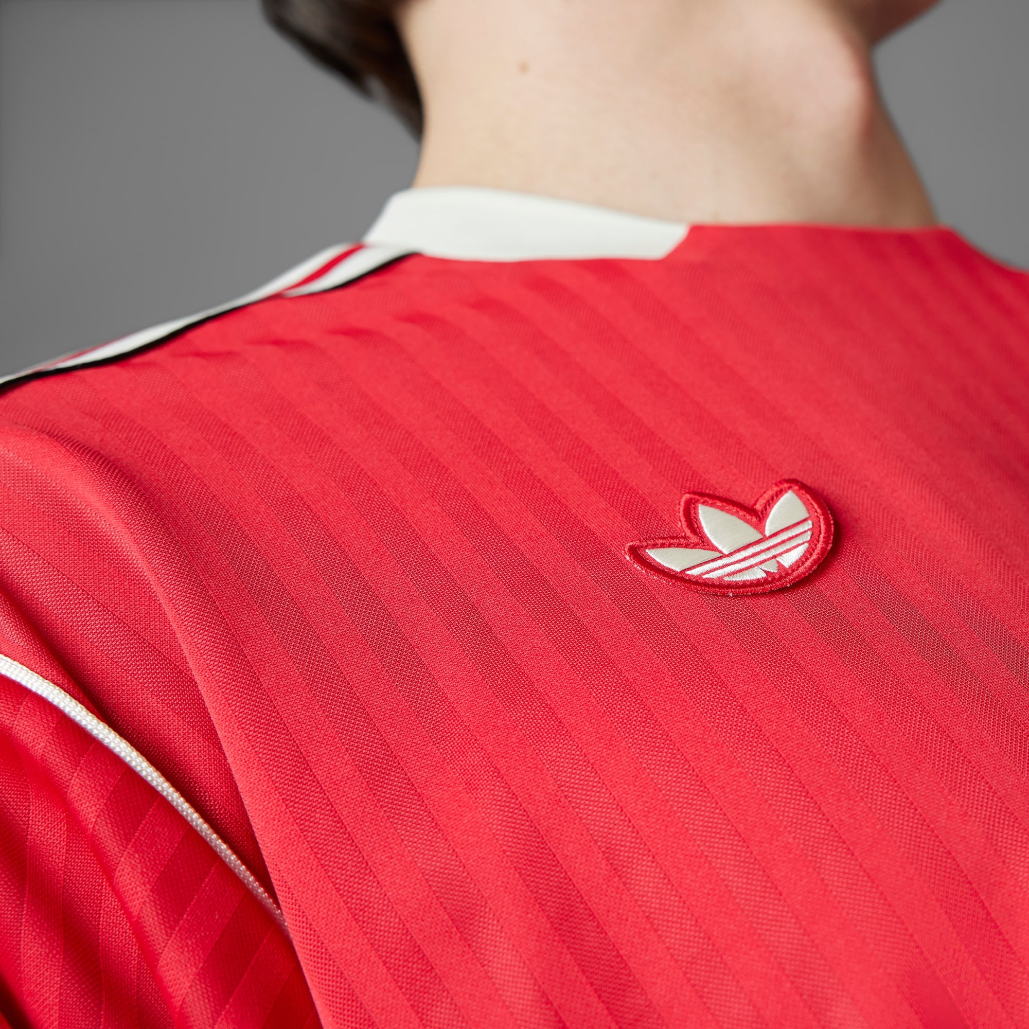 A football jersey with '80s stadium style, made with recycled materials.